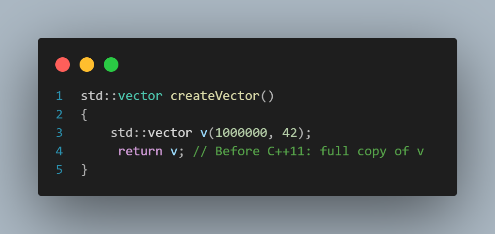 Imagine you have a std::vector<int> containing millions of elements. If you write a function that returns this vector, compilers before C++11 would create a full copy of the vector upon return. That’s because the only available mechanism was the copy constructor.